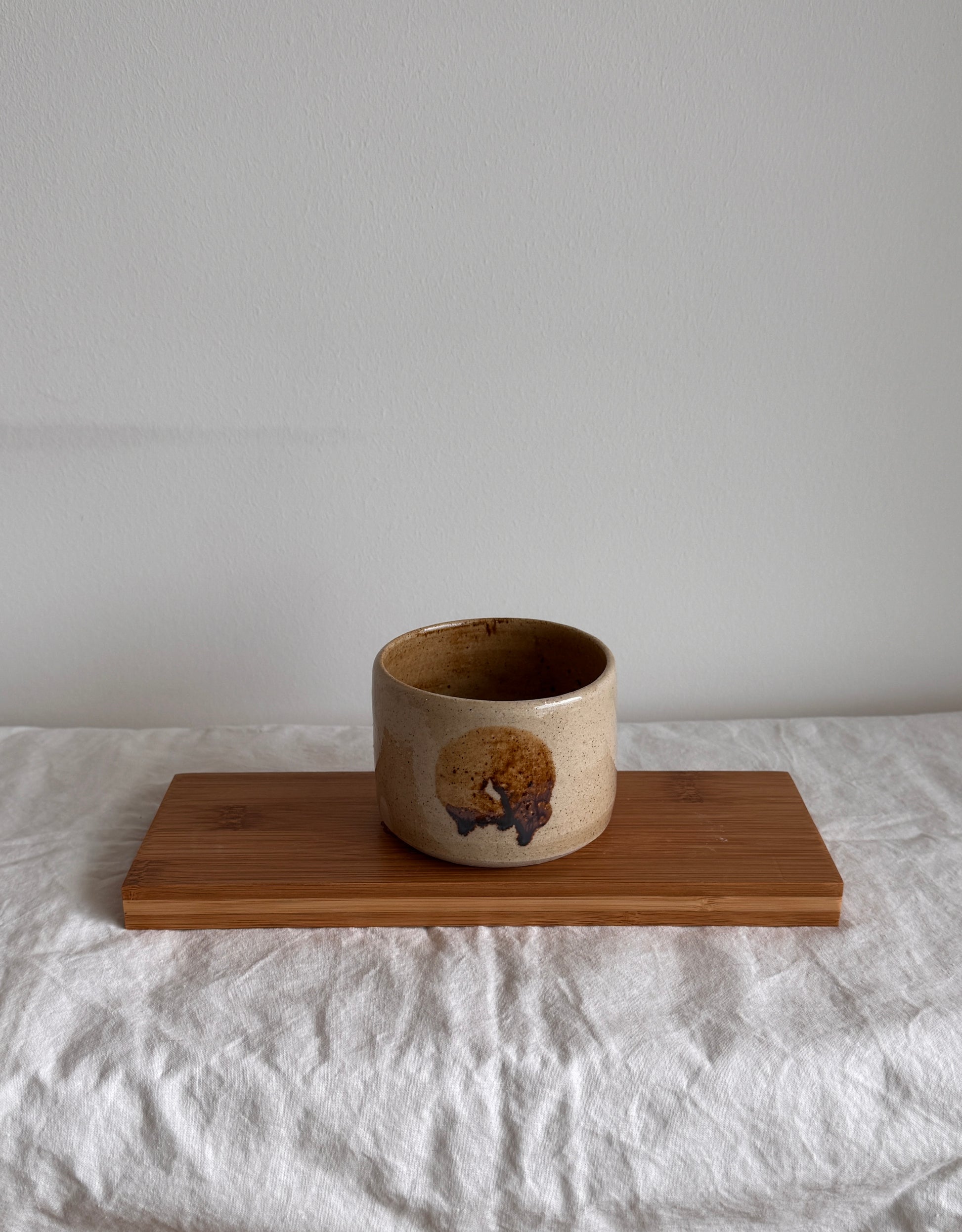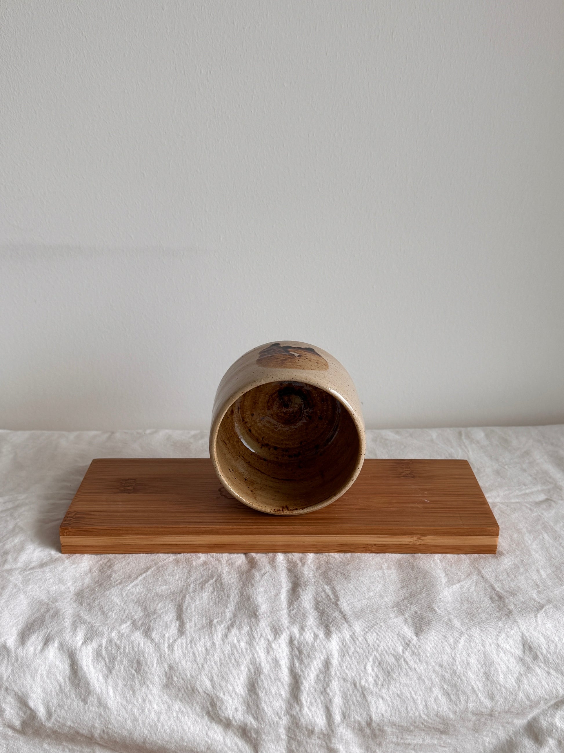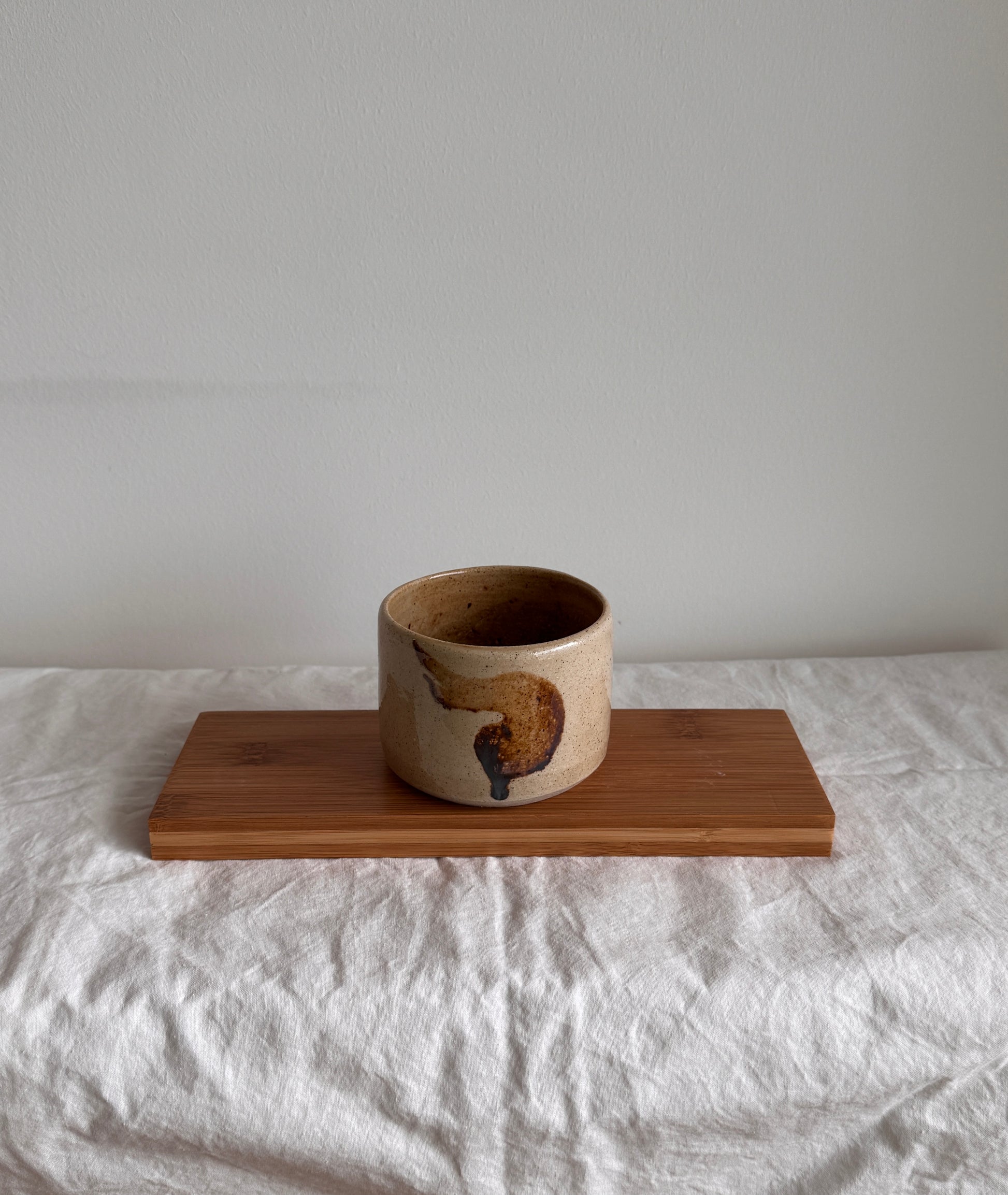 Stoneware cup glazed in a warm earthy tone, with organic brush-like marks that make each piece one of a kind.
