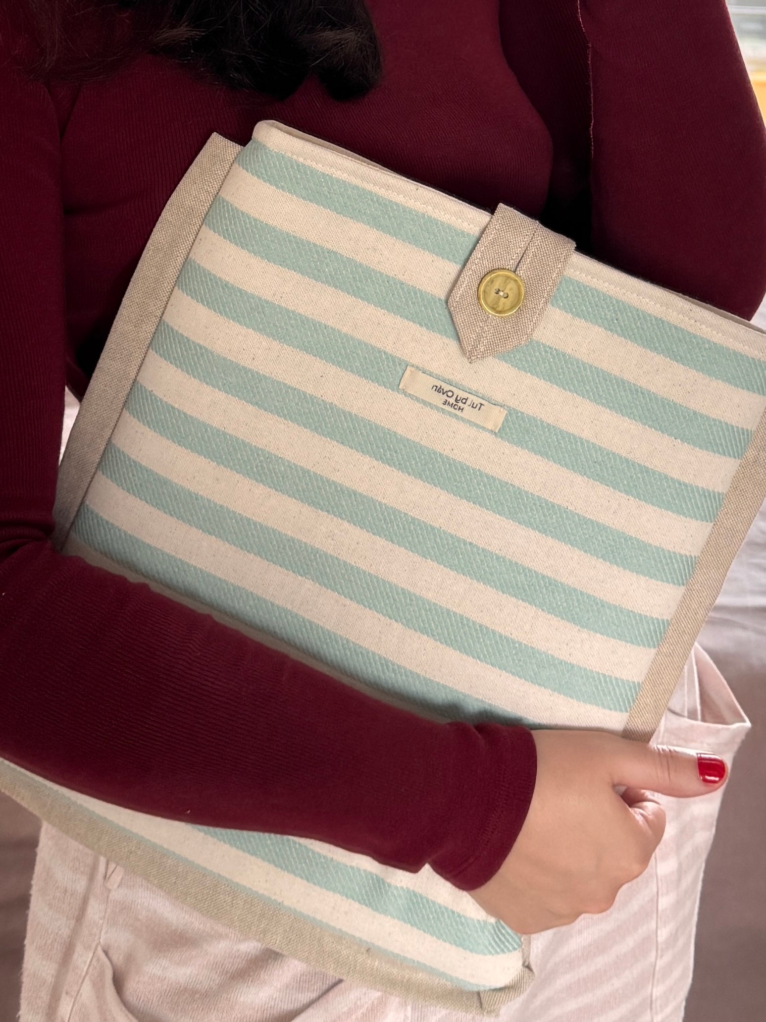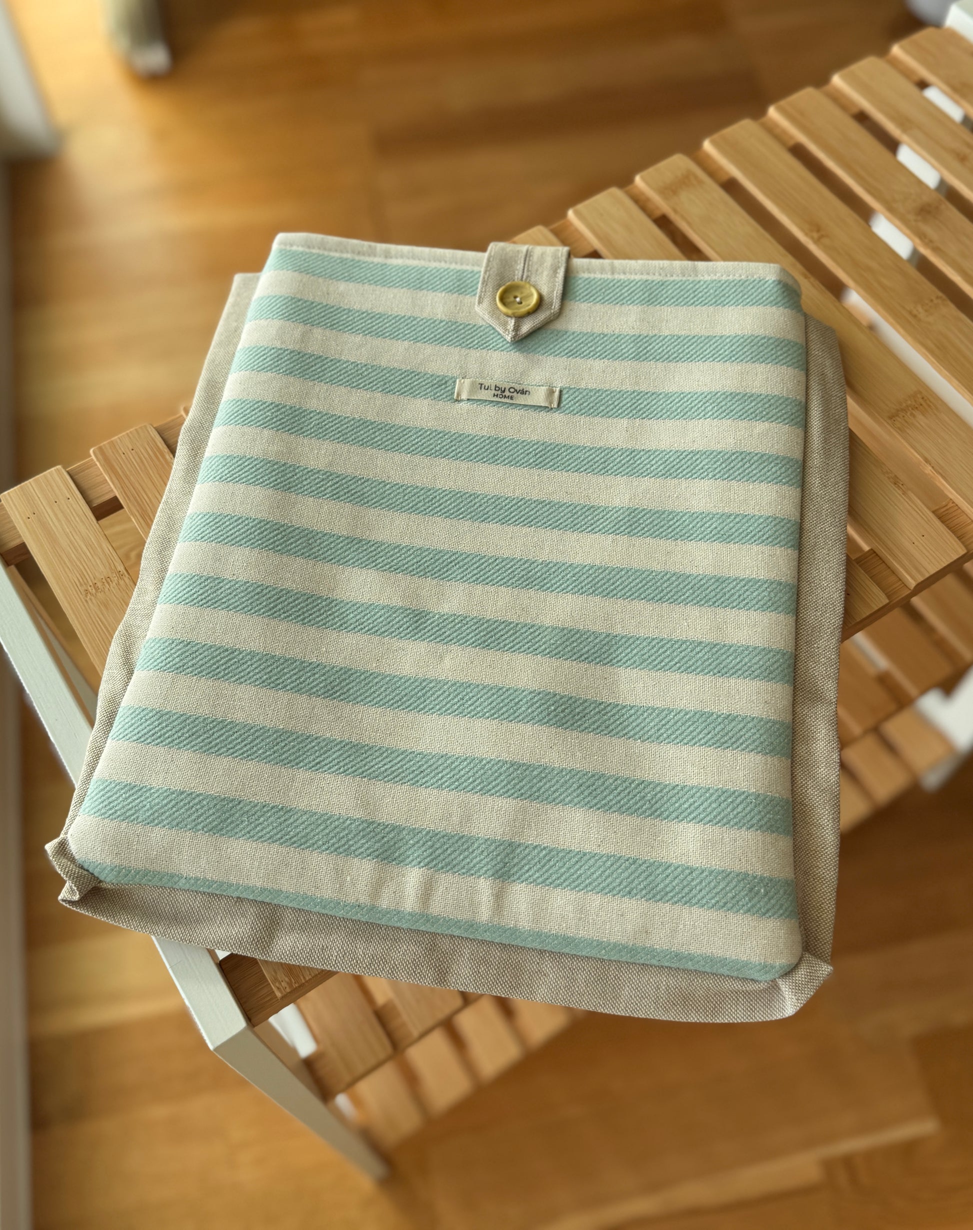 Made from a sturdy cotton-linen blend in soft stripes of seafoam green and natural beige, finished with a contrasting trim (available in light beige or grey) and a button closure.