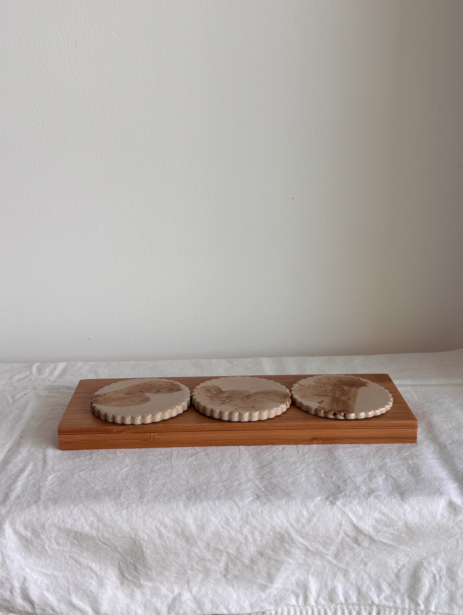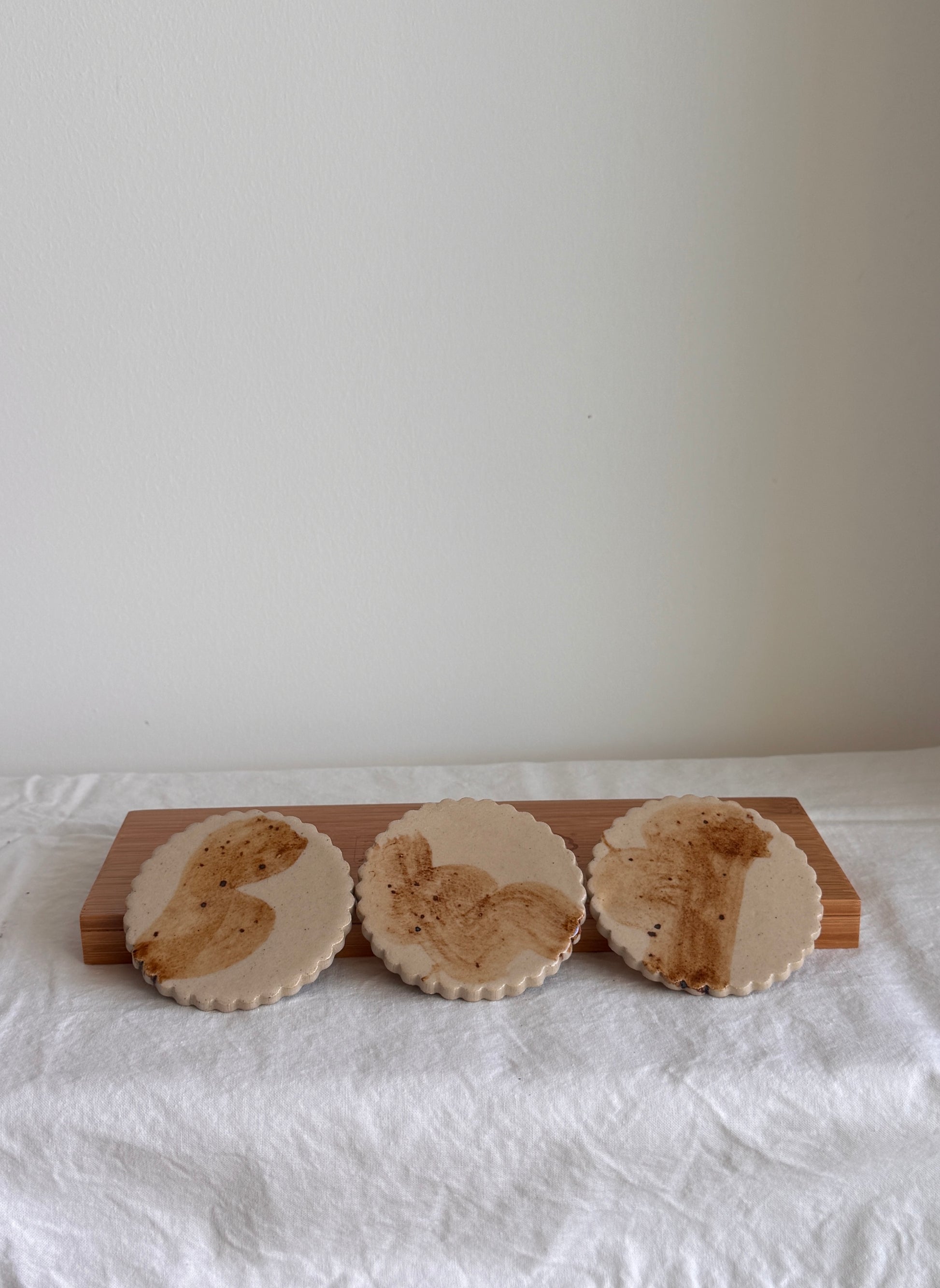 Set of three hand-formed stoneware pieces with a soft scalloped edge and warm brushstrokes of brown glaze.